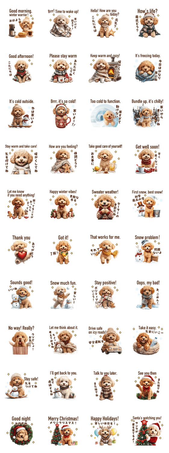 冬に使える英語フレーズを集めた冬の日常会話のトイプードル子犬スタンプ。日本語も付いているので英会話の勉強にも活用できます!クリスマスに使える言葉も入っています!