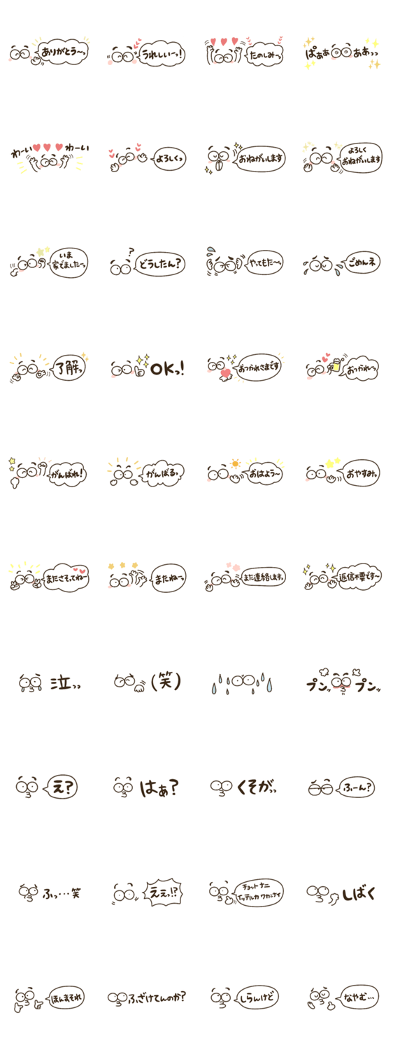 おめめまゆげちゃんの使いやすい省スペーススタンプです。可愛くて、少しくすっと笑えて誰にでも送りやすいスタンプです。大好きな人を想って作ったキャラクターです!