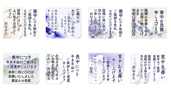 | スタンプ説明 | シンプルな喪中はがきの代わりのスタンプ 喪中につき新年のご挨拶を失礼/遠慮/故人の名前/享年/寒中見舞い/年末年始に必要な挨拶文/お祈り/永眠された/秋草/植物/朝顔/服喪 現在この商品は一部のスマートフォン版LINE 10.3.0以上のトークルームでのみ使用できます。動作環境の最新情報はヘルプをご確認ください。 |