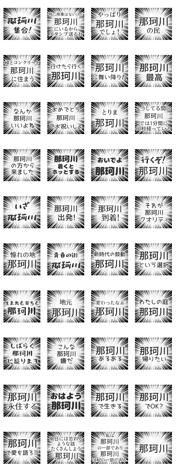 地元のための漫画風セリフスタンプ。集中線で叫べ。地元の人にも憧れてる人にも。面白いのが見つかると嬉しい。集中線。地元愛。