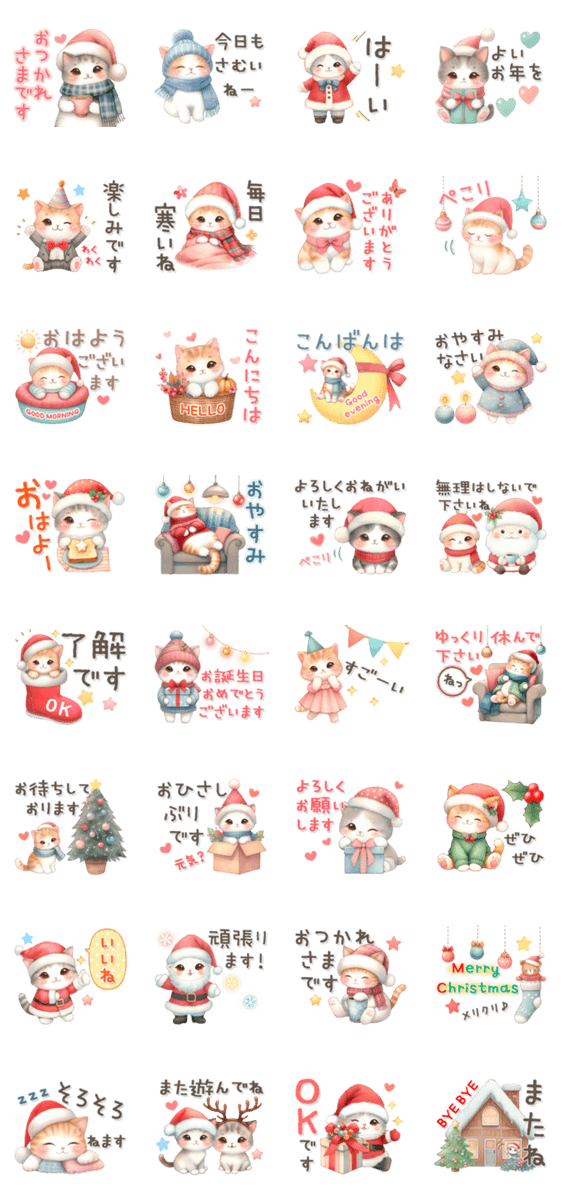 猫好きな方必見!冬&クリスマスにぴったりの可愛い猫のスタンプです☆年末年始によく使う基本の言葉を集めました。ほのぼの優しい癒し系。基本の挨拶や敬語が使いやすい♪