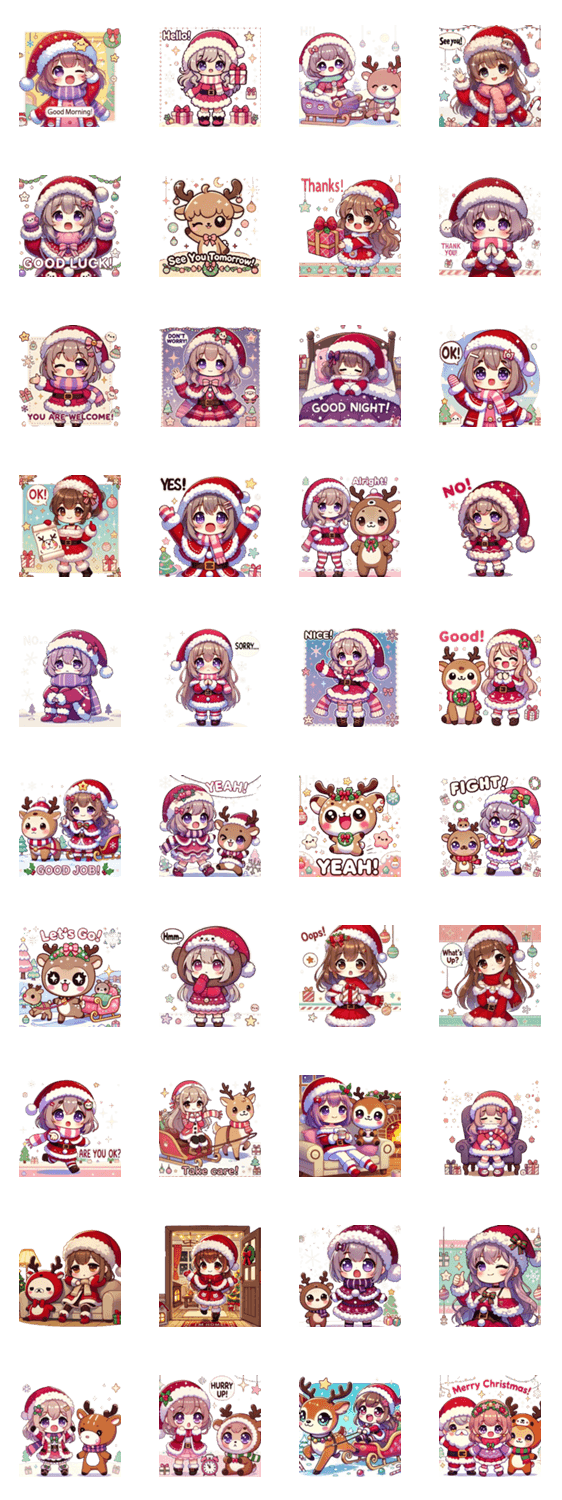 キラキラかわいいサンタガールズが大集合! 日常使いにピッタリな挨拶や感情表現でクリスマス気分を盛り上げるスタンプセットです!