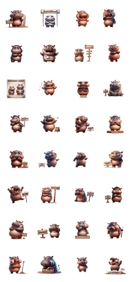 退屈そうな表情をしたコビトカバ。のんびりとした雰囲気やつまらない気持ちを表現するのに最適なスタンプです。