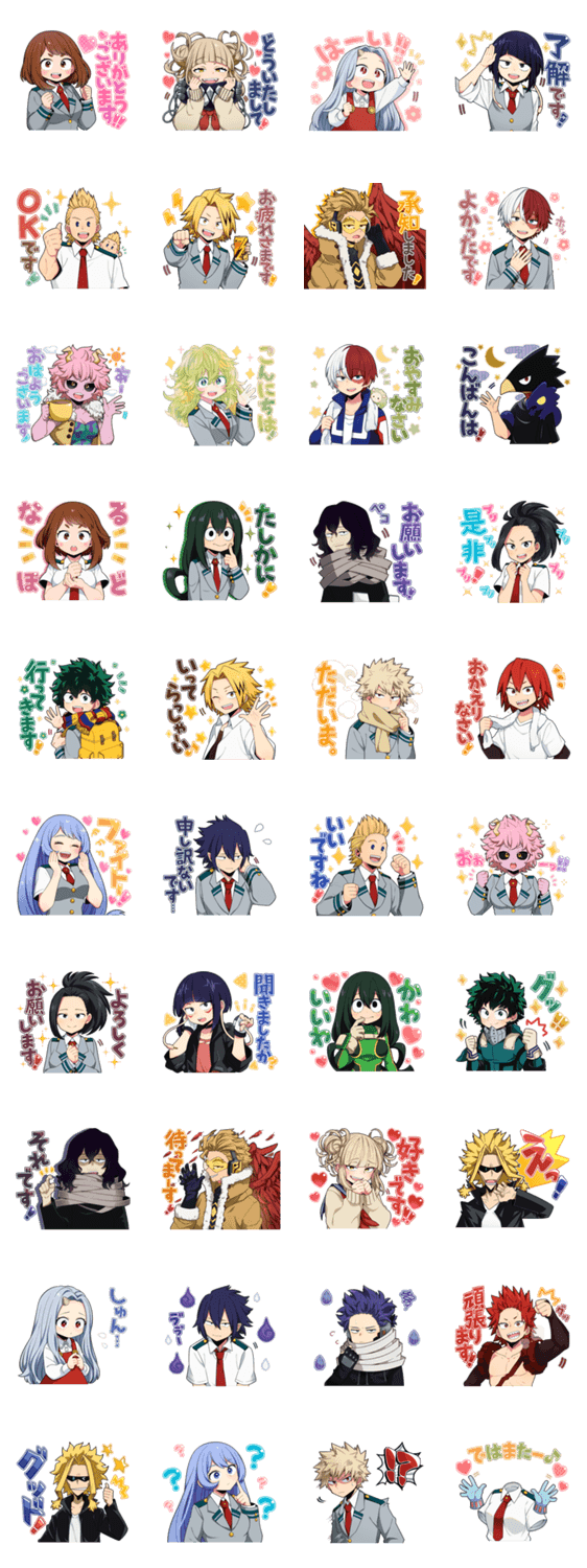 僕のヒーローアカデミアの毎日使える敬語篇スタンプです!出久、爆豪、轟、ホークス、お茶子、梅雨、トガヒミコ等、挨拶やリアクションが沢山入っています。 ※LINE Creators Collaboration 僕のヒーローアカデミア参加スタンプです。