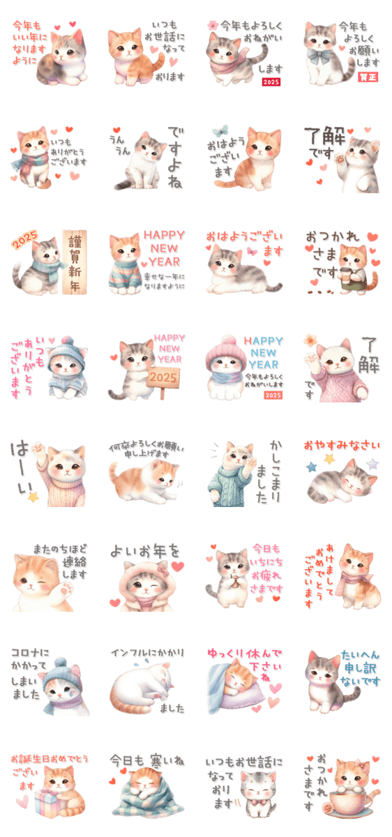 猫好きな方必見!毎日使える可愛い猫のスタンプです☆年末年始によく使う基本の言葉を集めました。お正月の挨拶や年賀状代わりに。(※2025年用に一部変更した改訂版です)