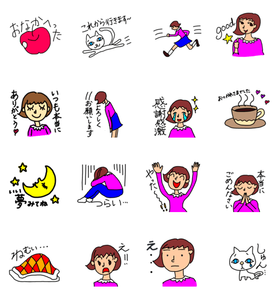 スマイリーリリーの日常を彩るスタンプです。白い猫を飼っているリリーちゃんのスタンプを、ぜひ使ってみてください。