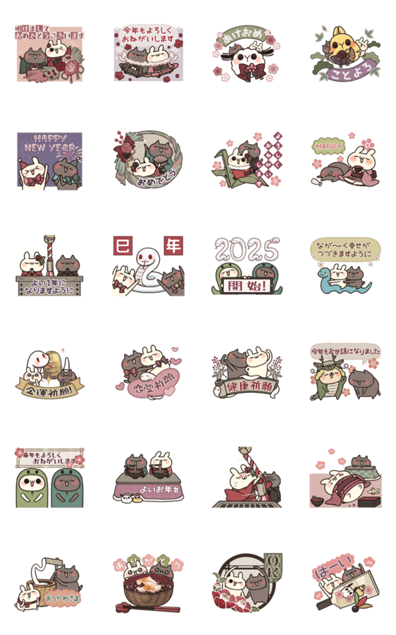 うさぎのしろとねこのくろの,動くスタンプお正月バージョンです。2025年は巳年!大人な雰囲気のくすみカラーと可愛いしろくろで幸せ招いちゃいます!