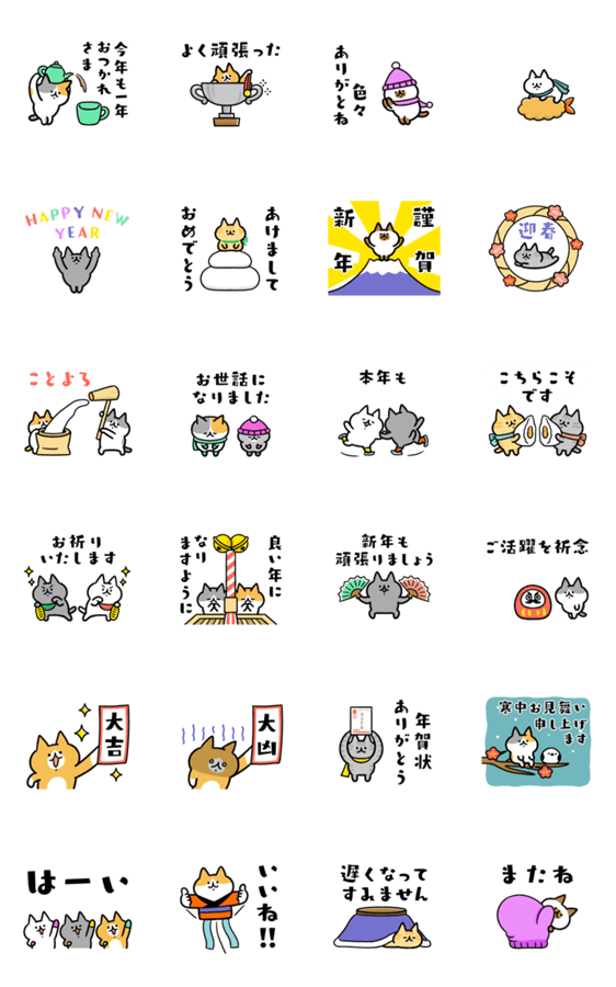 年末から年始にかけて、コミカルに動くネコたちがトークを楽しくサポート!毎年使える便利なあけおめスタンプです。