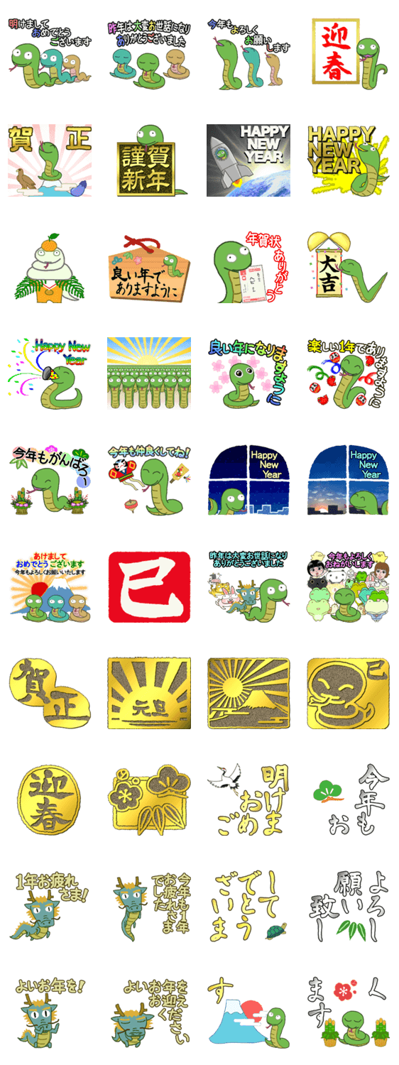 便利に使える巳年の年賀スタンプです。賀正、謹賀新年、迎春などもあります。年賀状の代りに送って楽しい!もらって嬉しい!みんなで正月気分を盛り上げよう!
