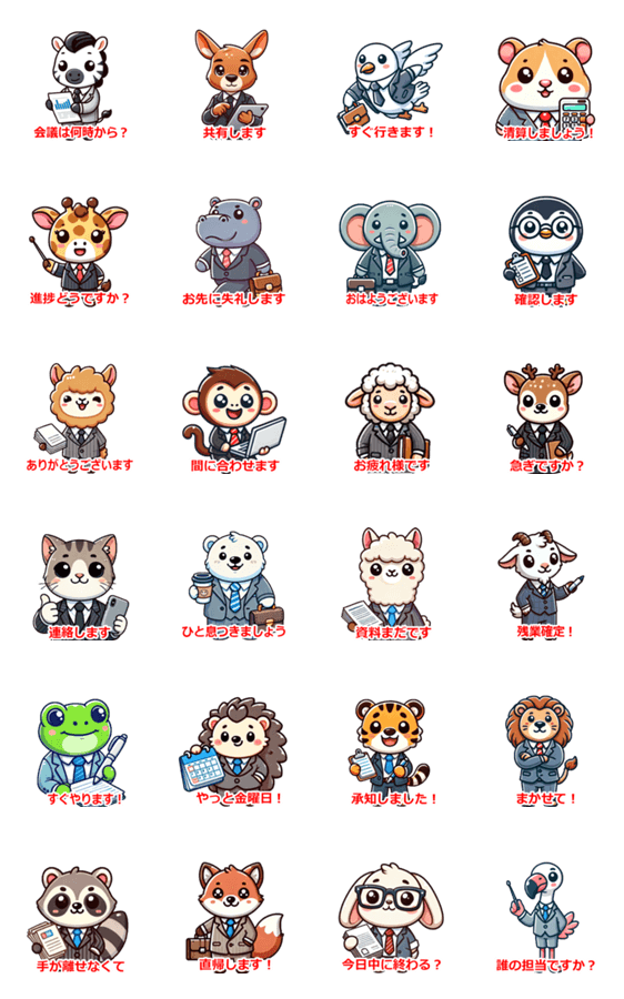 スーツの動物たちが使いそうな言葉をつかったラインスタンプです