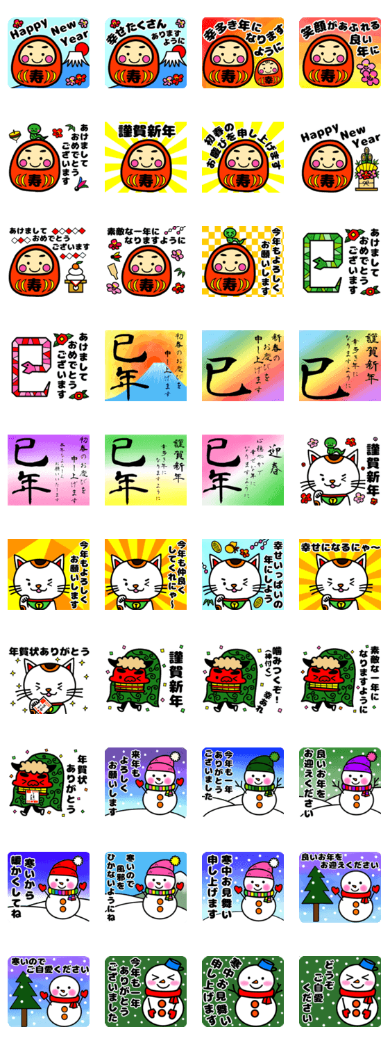 幸運のだるまやかわいい雪だるま、招き猫、獅子舞の年末年始用スタンプです。(年賀状/巳年/おめでとう/謹賀新年/へび/寒中見舞い/雪/富士山/梅の花/門松)