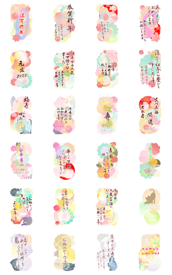 水彩画風の花と本格筆文字のお正月スタンプです。猫が隠れたり隠れなかったりしてます。ヘビもいます。華やか/かっこいい/年末/年始 ※このスタンプはトークルームで大きく表示されるBIGスタンプです。