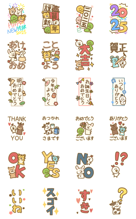 2025年のお正月 BIGスタンプです。 ねずみ、ウシ、トラ、ウサギ、蛇、馬、鳥、イヌ、イノシシのキャラクターや、あけおめ、ことよろ、等。日常でも使えます。 ※このスタンプはトークルームで大きく表示されるBIGスタンプです。