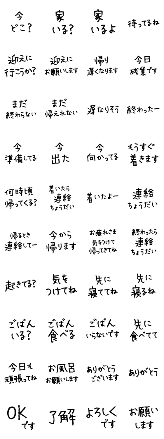 家族やカップル,恋人との連絡に!大きくて見やすい優しい手書きのデカ文字スタンプ。通院や仕事,学校の帰りなど,いろいろな場面で便利に使える.40代,50代,60代,70代の父母
