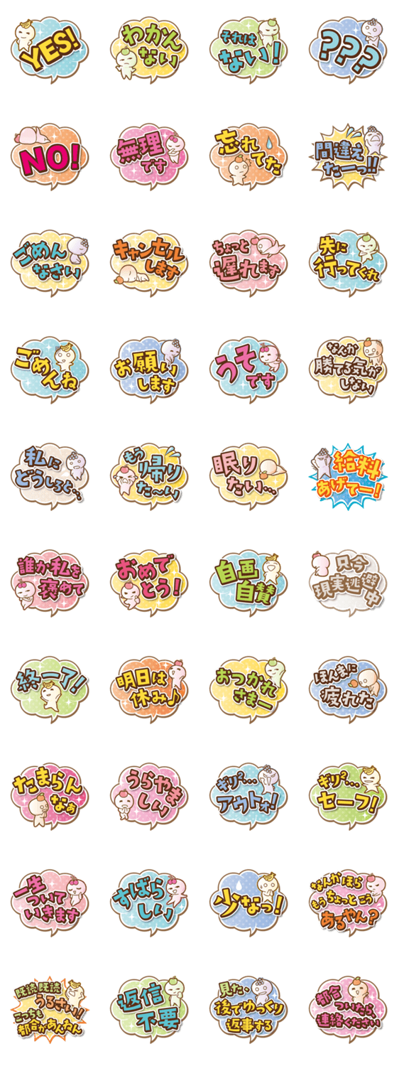日常会話を吹き出しにしてスタンプ化した第2弾です。第1弾と同様に楽しく使ってください。