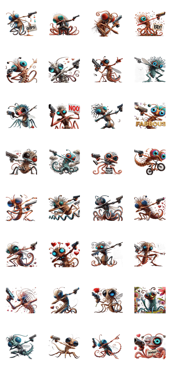 ハエエイリアンの絵文字ステッカー、勇気、対抗、SF、ユーモア、大胆さ、LINEスタンプ、イラスト、コミュニケーション、