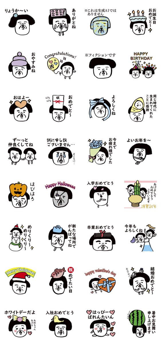 ありがとう、了解、おはよう、おやすみ等の毎日使えるものと お正月、クリスマス、ハロウィン、誕生日まで今世紀中使えるスタンプです。