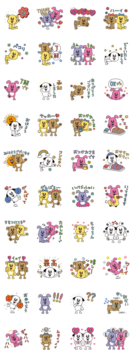 双子アニマルのカラフルでPOPなスタンプです☆ うさぎ/犬/くま/挨拶/返事/気持ち