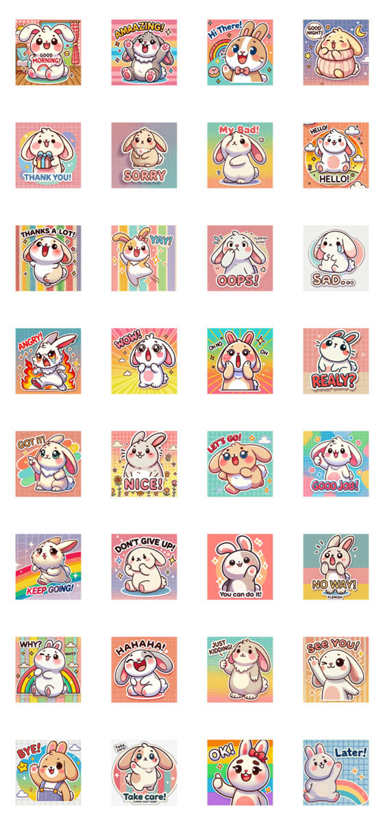 フレミッシュジャイアントの可愛いスタンプセット!日常会話や気持ちを表現する32種類のデザインで、癒しと楽しさをお届けします!