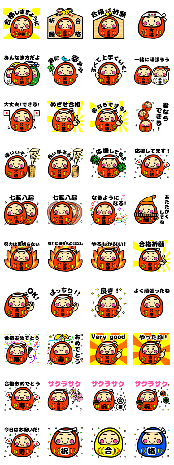 受験生を応援するスタンプです。幸運のだるまと共に頑張る受験生を応援しましょう!(だるま、受験、合格、サクラサク、必勝、寿、祝、応援、努力、絵馬、大吉、七転八起)
