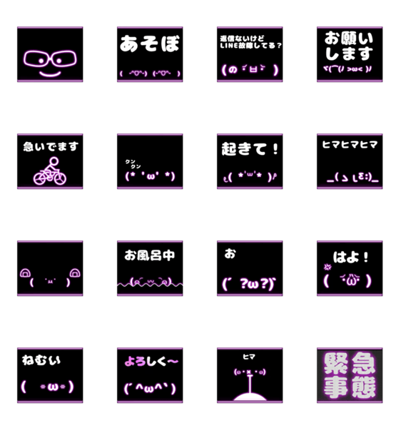 ネオン風動く顔文字スタンプです。ピカピカ光ってキレイだと思います。本当はもっとスタンプ数をもっと多くしたいのですが、スタンプメイカー作なので16個セットがMAXです