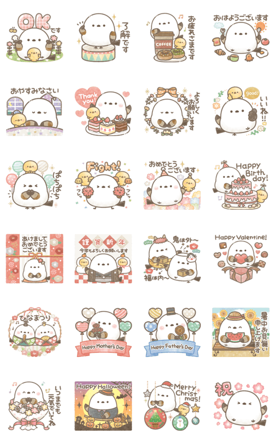 もちっと!シマエナガさん。の、1年中使える飛び出すスタンプです!(挨拶/正月/節分/バレンタイン/ひなまつり/母の日/父の日/暑中見舞い/敬老の日/ハロウィン/クリスマス)