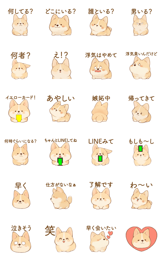 彼女へのネタ用スタンプ。犬好きにおすすめ(犬,コーギー,恋人,彼氏,彼女,カップル,嫉妬,夫婦,浮気)
