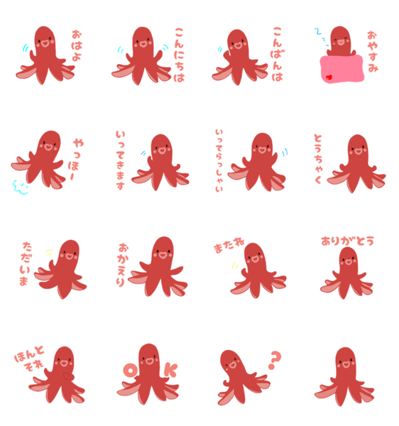 タコさんウィンナー/おはよう/こんにちは/こんばんは/おやすみ/いってきます/いってらっしゃい/とうちゃく/ただいま/おかえり/またね/ありがとう/ほんとそれ/オッケー/?
