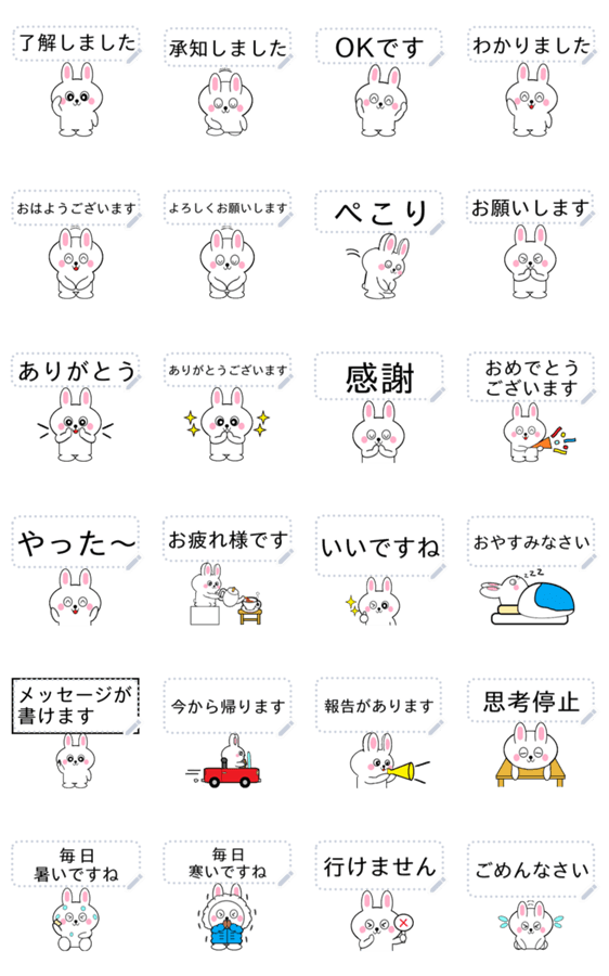 うさぎのメッセージスタンプです。横書きです。 現在この商品は一部のスマートフォン版LINE 10.3.0以上のトークルームでのみ使用できます。動作環境の最新情報はヘルプをご確認ください。