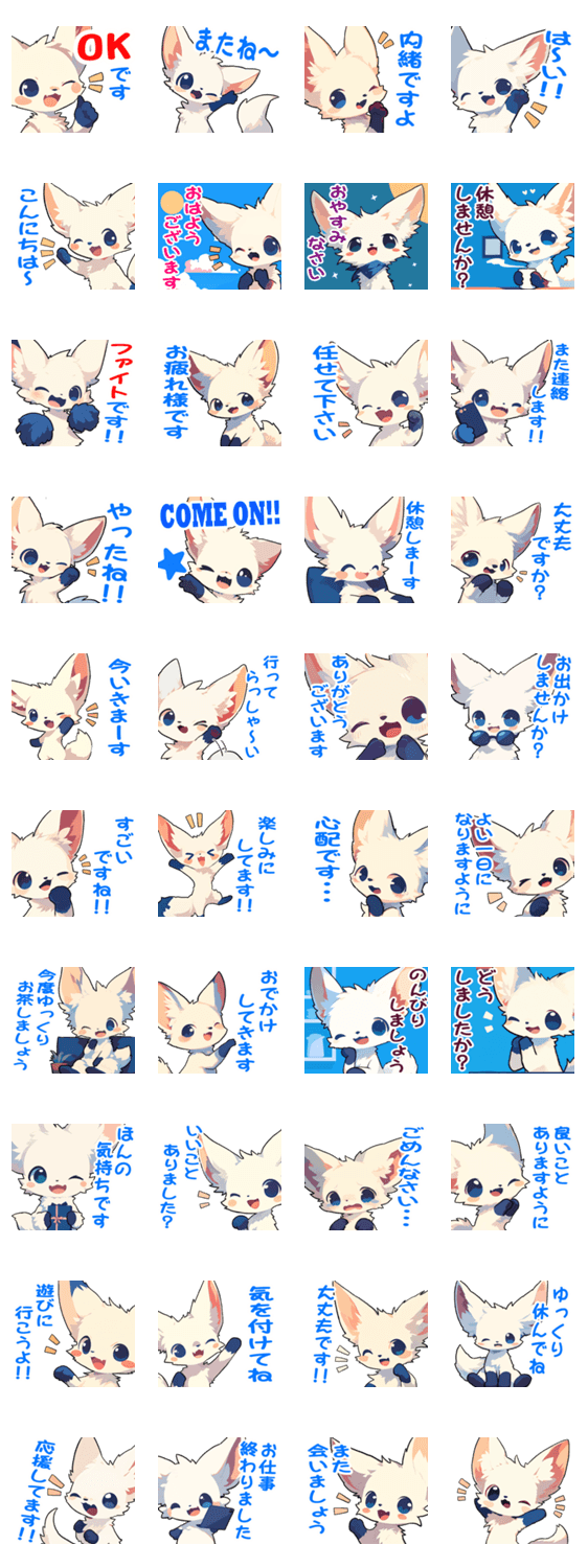愛嬌のあるホワイトフェネックのスタンプです。丁寧な言葉や敬語・日々の会話に。 白いキツネ/狐/もふもふ/バレンタイン/ネイビー/藍色/青色/白色/日常/どうぶつ/動物