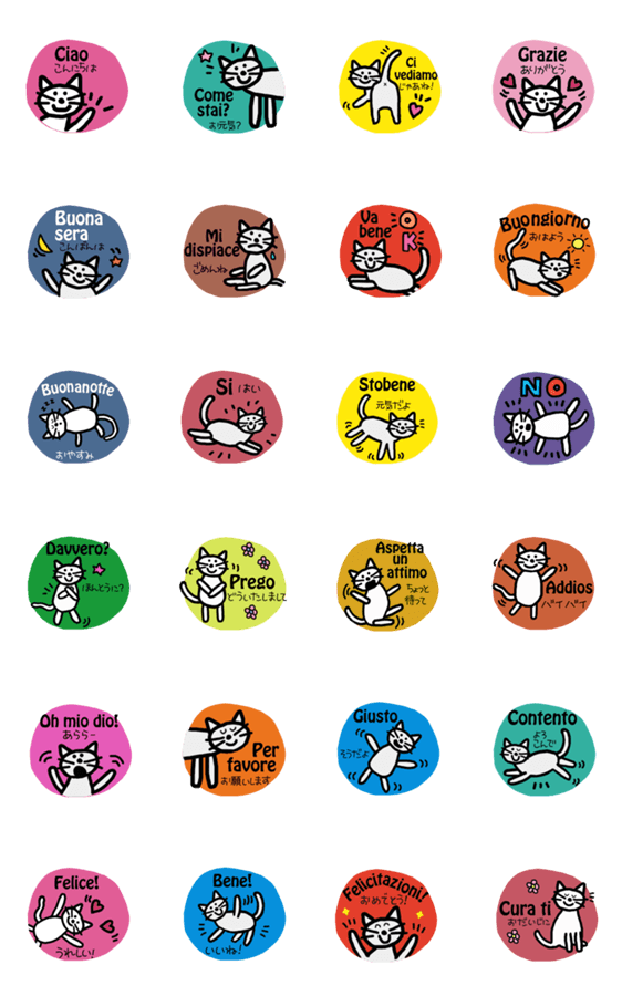 簡単な日常会話に使えるスタンプです。楽しくイタリア語を使ってみよう。