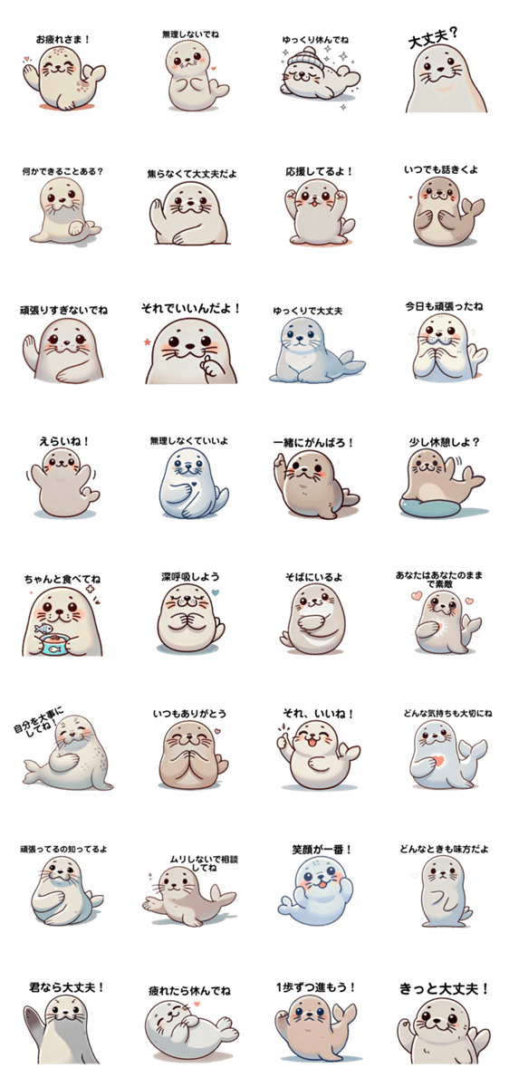やさしく気遣うアザラシのほっこりスタンプ♪ 「疲れた時、落ち込んだ時、頑張る時。どんなシーンでも、アザラシがそっと寄り添ってくれる癒しのスタンプです♡