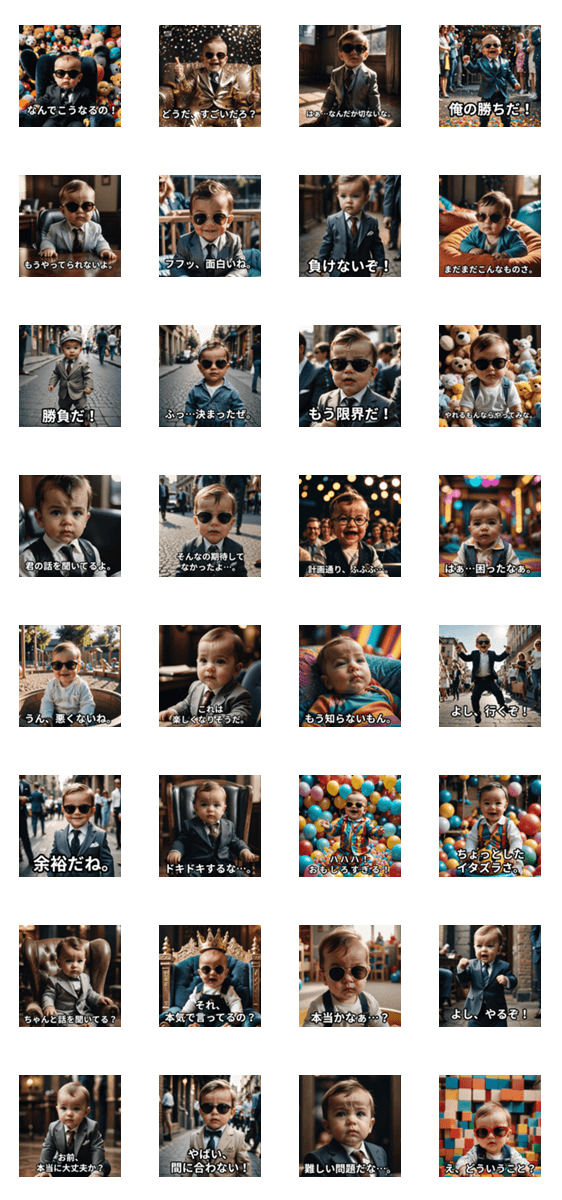 赤ちゃんなのに紳士的でクールな魅力を持つユニークなスタンプセットです。おしゃぶり片手にネクタイを締めたり、ダンディな表情を見せたり、大人顔負けのスタイルが魅力。