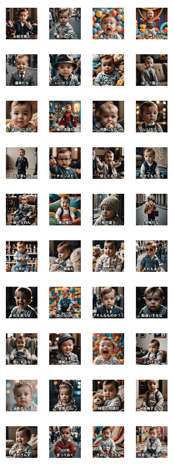 スーツを着たスタイリッシュな赤ちゃんが、40種類の表情で登場!得意げな笑みから渋い頷きまで、トークやリアクションにぴったり。ダンディな魅力を今すぐ追加しよう!