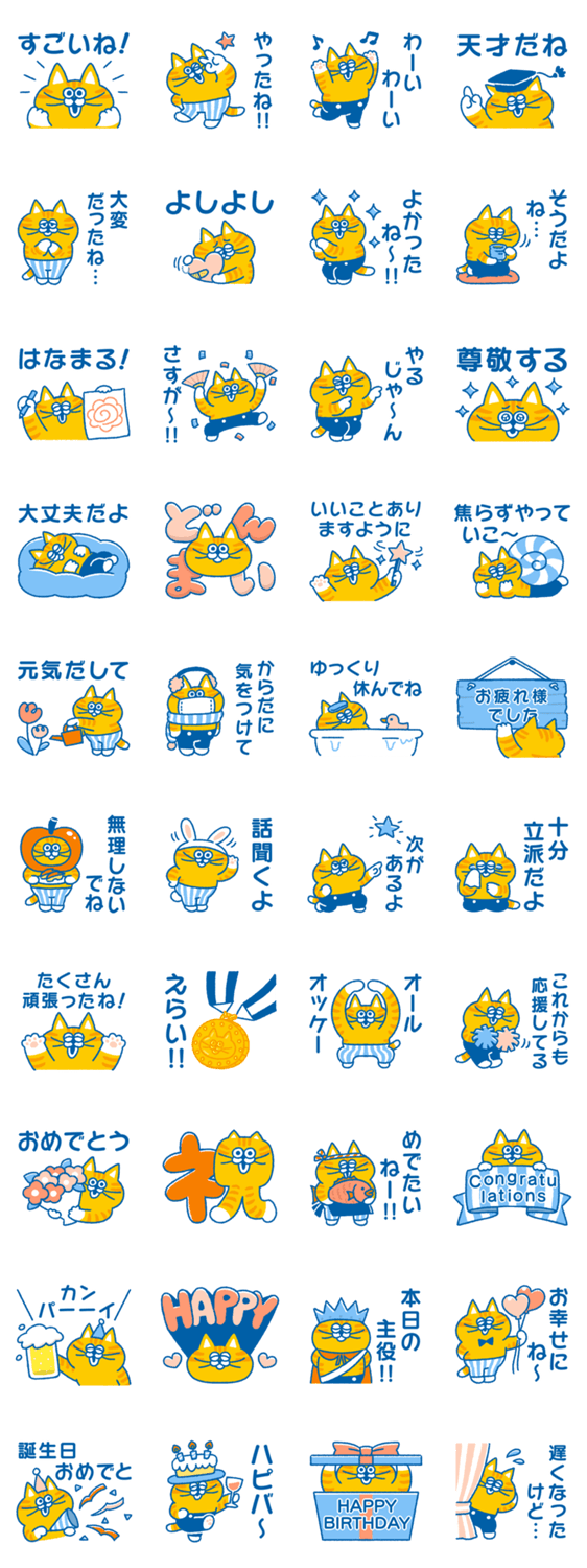 元気なとらねこ茶男(ちゃお)が応援と労いとお祝いの気持ちを伝える楽しいスタンプです。 (文字に誤りがあった為修正いたしました)