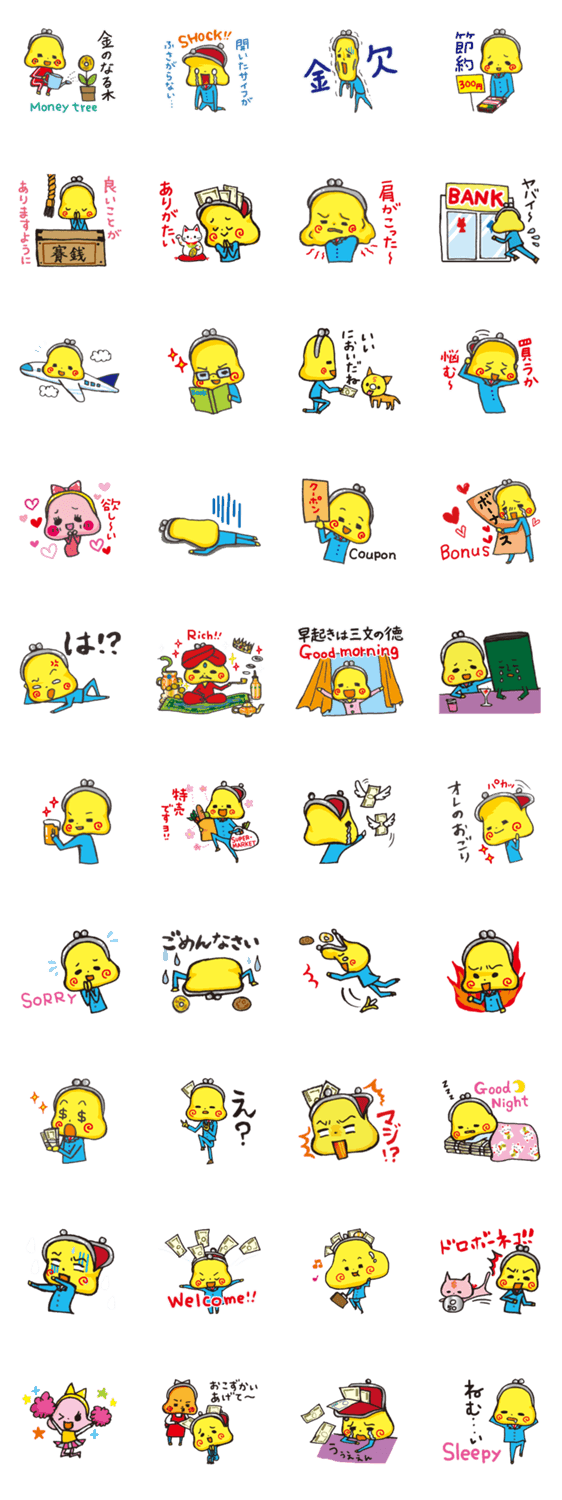 成金めざして日々金のなる木を育てるサラリーマンのおサイフ君。神頼み、金欠の辛さ、夢や願望のつまったお財布事情スタンプ。イラストレーターミュウミュウのスタンプ