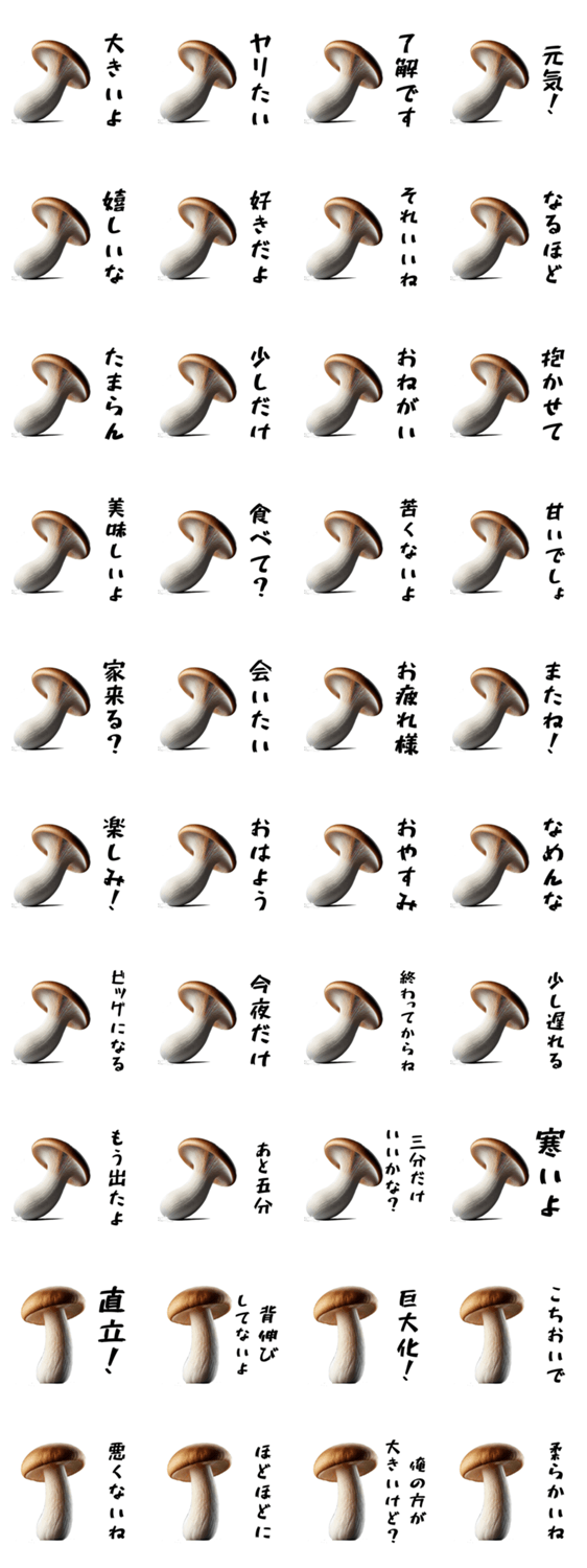 おしゃべり好きな可愛いきのこが、楽しい表情で感情を伝えます。日常会話やリアクションにぴったりです。トークをもっと楽しく弾ませよう!