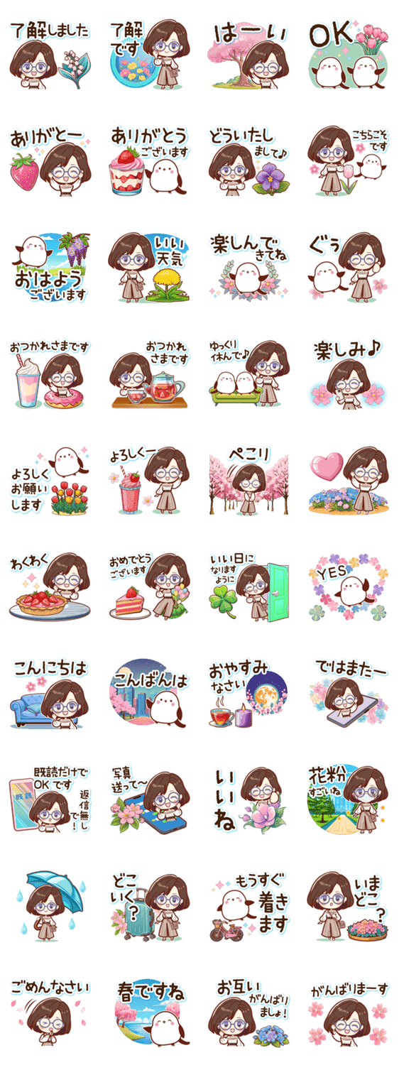 眼鏡をかけている女性にオススメ!人気の可愛いシマエナガと、春のイラストでいろんな返信が返せます♪敬語/挨拶/春/花粉症/桜/苺/お花見/待ち合わせ/眼鏡女子/大人/シニア
