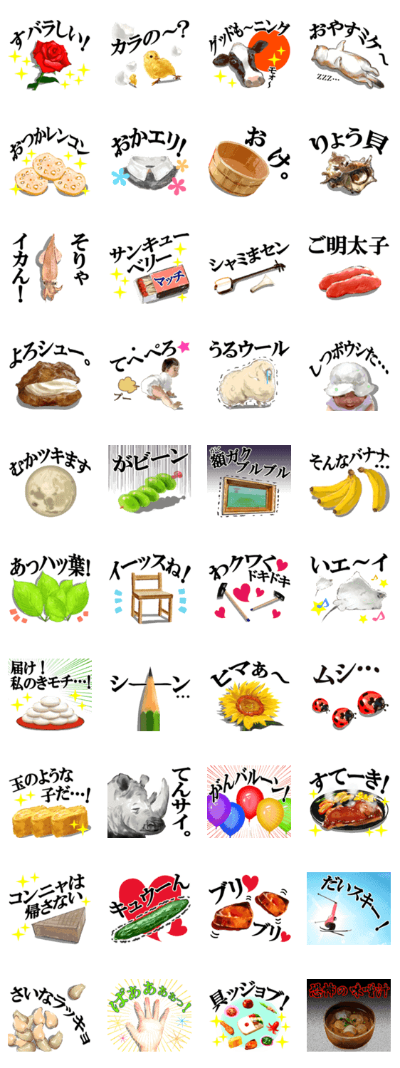 リアルな物や食べ物、動物のダジャレスタンプの続編です。