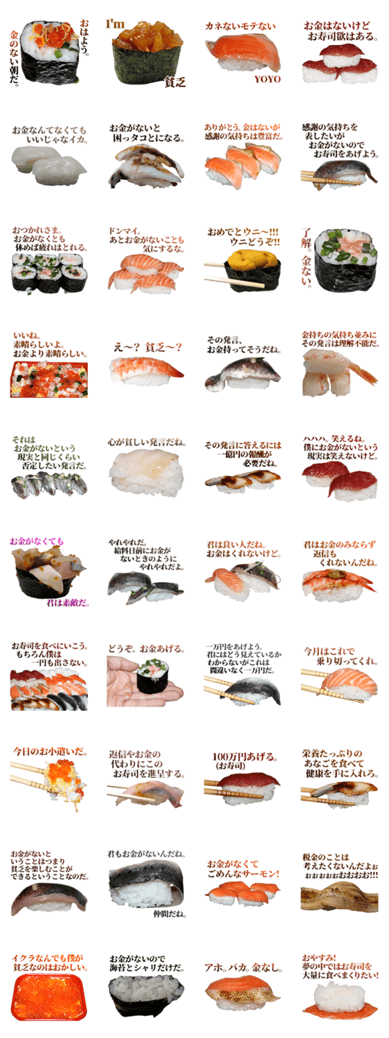 お金がないお寿司のスタンプです。金銭欲は人類共通の欲望。びんぼう、ビンボー、煽り、面白い、金欠、税金、低所得者、お金持ち。実写食べ物スタンプシリーズ。