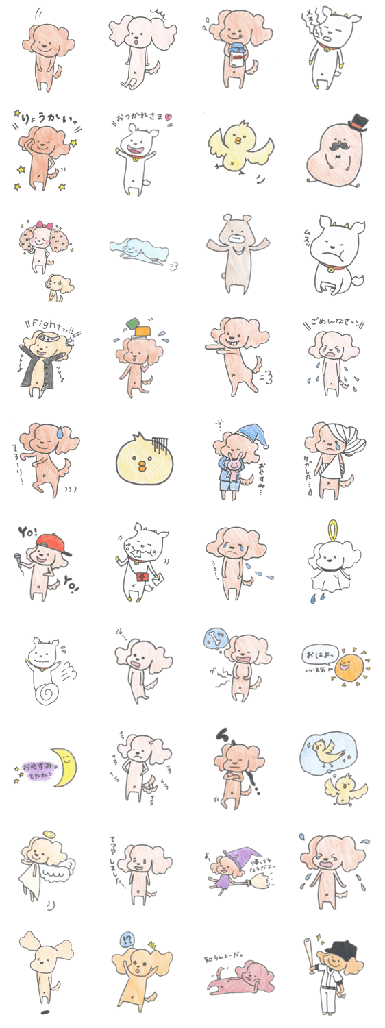犬のミントさんとゆかいな仲間たちが大集合!!色鉛筆で描かれた、ゆるーい仲間たちをぜひLINEのお供に…。