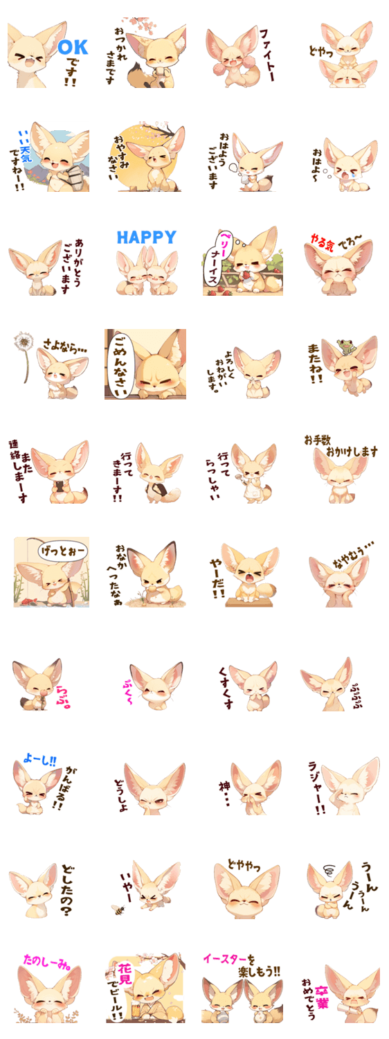 キツネに似た黄色いフェネックの春ぽかぽかスタンプ日常会話に一年中使えます。 ふぇねっく/きつね/ビール/チューリップ/イチゴ/卒業式/入学式/カエル/桜/花見/イースター