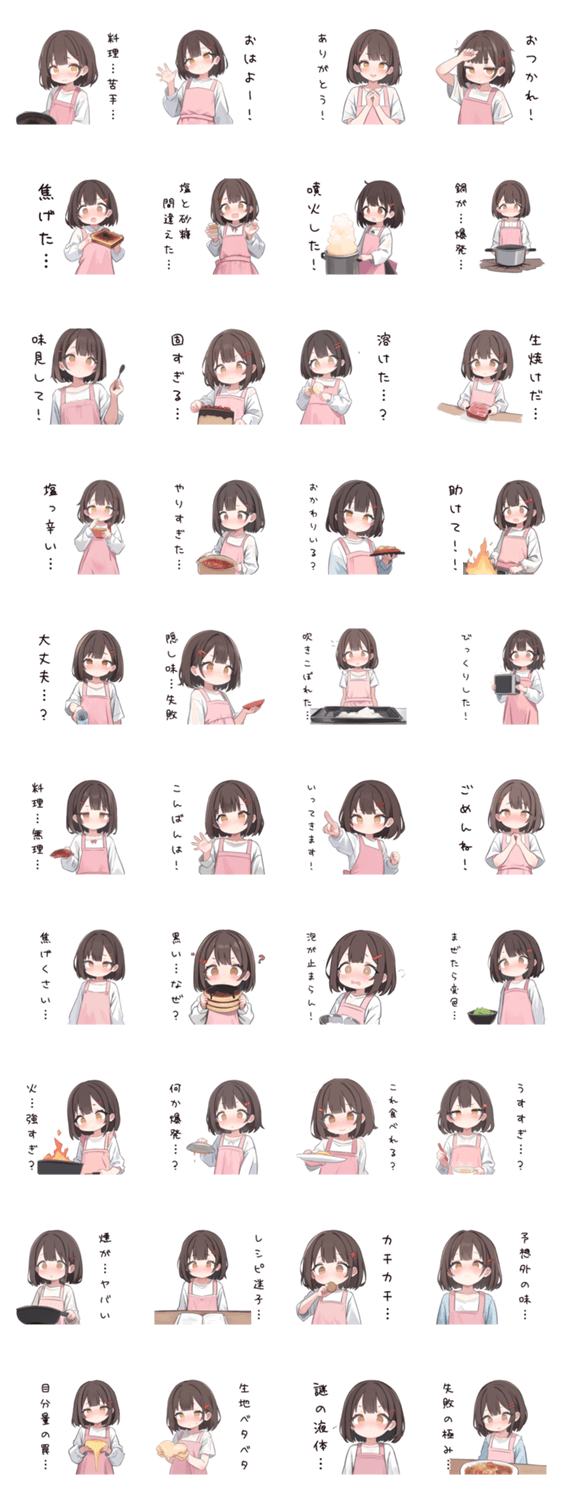 料理が苦手で失敗続き?焦がす、こぼす、レシピを間違える…そんなドタバタを詰め込んだスタンプです。料理の失敗談にぴったり!