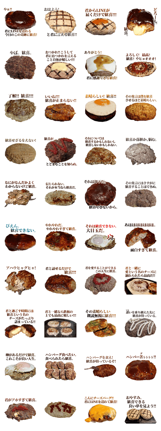 ハンバーグが歓喜するスタンプです。喜びは何よりも勝る。嬉しい、ハッピー、幸せ、最高、ポジティブ。はんばーぐ、肉類、牛肉、ひき肉、飯テロ。実写食べ物スタンプ。