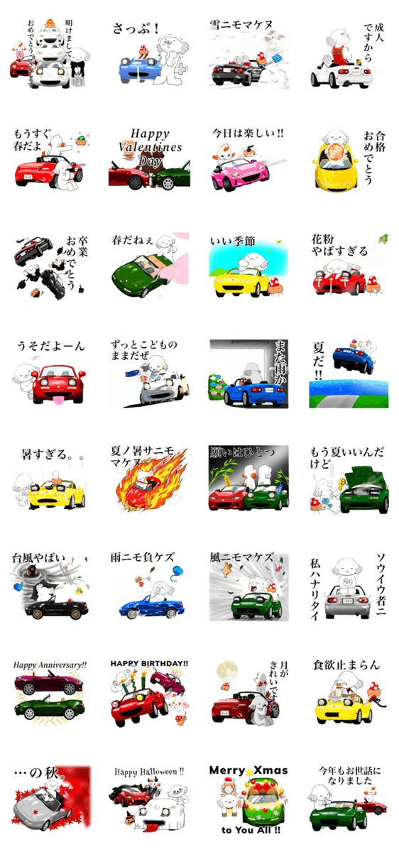 オープンカー(コンバーチブル、カブリオレ、ロードスター)が大好きなわんこと仲間が過ごす一年のスタンプです。