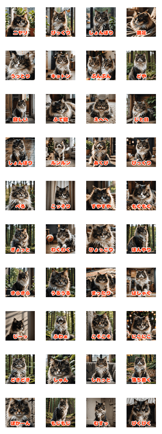 ふわふわ&もこもこのノルウェージャンフォレストキャットが、あなたの気持ちをスタンプでお届け!嬉しい時も、眠い時も、怒った時も、この猫たちがトークを盛り上げます!
