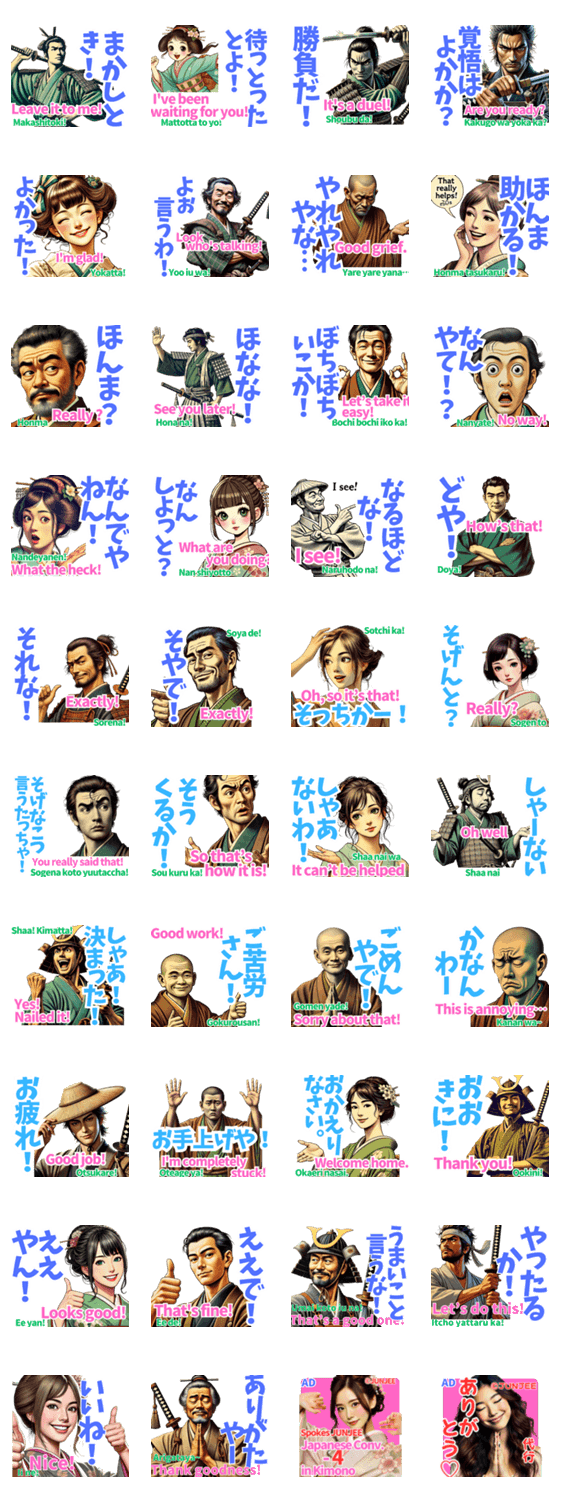 江戸時代の侍,町娘,渡世人,お坊さん,町人が短い応答の会話をします。年配から若い人まで,あらゆる世代,場面で使えます。将軍に出てくる,そのままの人物たちが登場します。