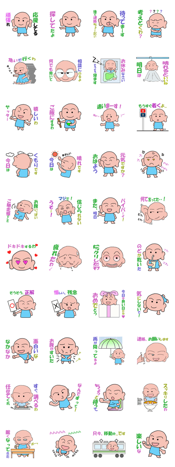 お出かけをしている時と日常会話を子供っぽい大人のスタンプにしました。みんなで使って下さい。