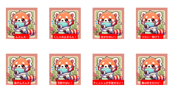 花粉と戦うレッサーパンダのスタンプ!「ムズムズ…」「くしゃみ止まらん!」など、花粉症のあるあるをユルカワに表現。春のトークにぴったり!