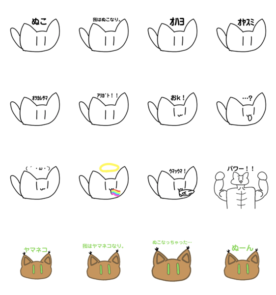 オリキャラ「ぬこ」のカオスなスタンプです。ついでに、ヤマネコもぬこになっちゃいました。